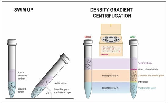 - Xue, X.; Wang, W.S.; Shi, J.Z.; Zhang, S.L.; Zhao, W.Q.; Shi, W.H.; Guo, B.Z.; Qin, Z. Efficacy of swim-up versus density gradient centrifugation in improving sperm deformity rate and DNA fragmentation index in semen samples from teratozoospermic patients. J. Assist. Reprod. Genet. 2014, 31, 1161–1166. [Google Scholar] [CrossRef]