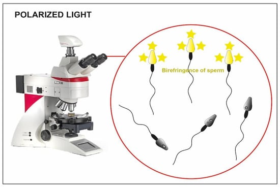 Using polarized light implemented in the microscope (Figure 3) is another possible strategy for the selection of immotile sperm cells [33]. Some research teams have proposed its use to verify the birefringence of sperm cell head as an index of suitability. As a matter of fact, the sub-acrosomal protein filaments extend themselves longitudinally, giving a typical pattern of birefringence to the sperm cell head [34]. In some published studies, the selection of non-motile spermatozoa with birefringent heads resulted in an increase in clinical pregnancy and implantation rate (58% vs. 9% and 42% vs. 12%), compared to a control group with immotile spermatozoa (where polarized light was not used) [81], and an increased implantation rate when the HOST technique was used instead as selection method (45% vs. 11%) [82].