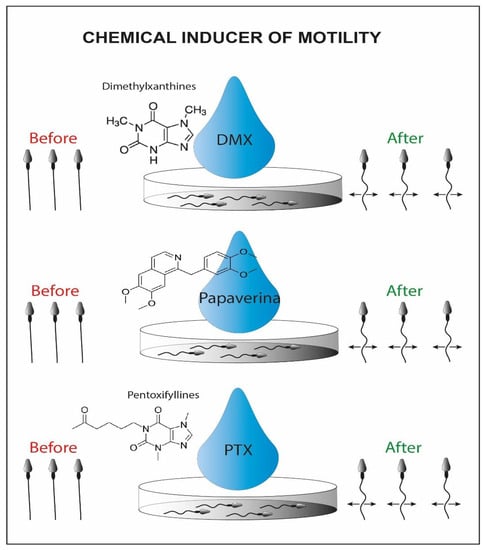 A group of researchers has shown another potential method to recover immotile but suitable sperms for ICSI. It exploits the chemical inducers of motility (Figure 4), that belong to the class of phosphodiesterase inhibitors, such as pentoxifylline (PTF), dimethylxanthines and papaverines [90], allowing the motility reactivation of spermatozoa recovered from the testicular and epididymal level [91]. Using this motile fraction, it was possible to obtain fertilization, normal pregnancies, and an increase in birth rate through ICSI [92,93,94]. Some doubts about the technique concern the intrinsic toxicity of these molecules towards the genetic material, but results from studies suggest that in vitro treatment adequately improves motility of immotile sperm, without leading to acrosome reaction, DNA damage, and viability loss [95,96]. Comparing this technique with HOST, researchers have obtained a higher fertilization and pregnancy rate (32% vs. 16%) [97].