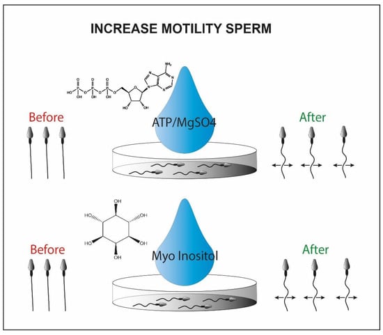 Alternatively, the myoinositol can be used to isolate viable sperm cells for ICSI. It represents the most abundant stereoisomer of the inositol class modulating the intracellular concentration of Ca2+ [103]. This is synthesized in two steps by two enzymes, myo-1-phosphate synthase and myo-monophosphatase-1, located in high concentration in the testicular mesenchymal tissue [104,105]. By incubating sperm cells frozen and then thawed from oligoasthenospermic patients with myoinositol, some research groups were able to recover a portion of sperm cells with significantly increased motility [101]. Myoinositol generates an increase in mitochondrial membrane potential, resulting in an intracellular increase of Ca2+ [106]. The research group performed a series of ICSI by pre-incubating sperm cells from oligoasthenospermic patients in solutions containing myo-inositol [107]. The increase in motility and fertilization rate has generated encouraging results. Unfortunately, one of the key objectives for ART laboratories is to mimic the culture conditions in vivo and myoinositol, as the ATP/MgSO4, could generate an uncontrolled increase in the mitochondrial membrane potential which could lead to the occurrence of toxic effects. Further studies should be conducted to incorporate this practice into clinical routines [108].