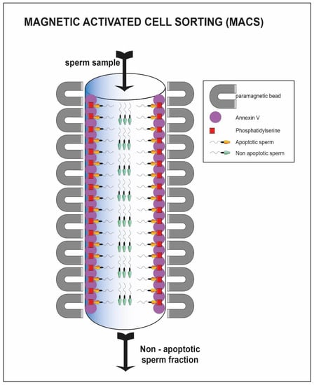 A further method that takes advantage of the membrane characteristics is the magnetic activated cell sorting (MACS). This methodology allows the selection of the non-apoptotic portion from a sample of interest [114]. It involves the use of magnetic microspheres conjugated to Annexin V (AV-MACS) (Figure 7) [115], that have a high affinity for phosphatidyl-serine. The latter is normally exposed on the outer side of the membrane when the sperm cells are in an apoptotic state [116]. The seminal sample of interest passes through a column containing microspheres, to which the annexin has adhered. The non-viable spermatozoa remain trapped inside the column, while the viable fraction is eluted, improving the vitality characteristics of the starting sample [41,42].