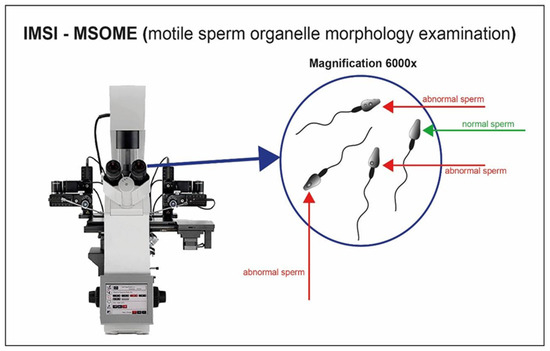 The analysis of semen quality has for a long time been associated with the morphological evaluation of spermatozoa. The introduction of digital microscopy has made its possible to analyze the ultrastructural characteristics of motile spermatozoa (MSOME; motile sperm organelle morphology examination) [126]. The integration of the MSOME into the ICSI method allows a high-magnificence micro-injection (IMSI) (Figure 9) [127]. The selection of motile spermatozoa with few vacuoles and normal nuclear morphology is possible through a 6000× magnification system integrated with the micromanipulation system [128]. Again, the scientific data are promising but conflicting. Using this method, some studies [56] have revealed that the presence of large vacuoles in the sperm nucleus is associated with a high level of nuclear fragmentation. In case of repeated fertilization failure with the ICSI method, the IMSI method has been suggested as preferential [57]. On the other hand, some authors [58] did not find significant differences in terms of fragmentation or pregnancy rates between ICSI and IMSI. Recently, in a study conducted on a large sample of semen analyzed with MSOME, no correlation was found between the presence of vacuoles in the nucleus and DNA fragmentation [59]. The authors argue that vacuoles are physiologically present in the sperm head, and they do not affect their functions. Unfortunately, due to lack of literature, the timing of the analysis and the cost of the equipment, the IMSI method has not been fully adopted in the routine practices of ART clinics.
