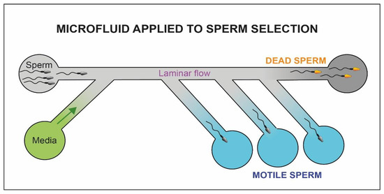By controlling fluid dynamics (Figure 10), within millimeter diameter capillaries, it is possible to mimic the physiological conditions of pH and temperature of the female genital tract [141]. Hence, we could potentially select spermatozoa with increased motility through flows [142], chemical gradients [143] or electrophoretic fields [144]. The method of Smith and Takayama [60] uses two parallel laminar flow channels. While the motile spermatozoa can move through the flows and be eluted separately, the debris and immotile cells are passively transported from the entrance to the exit of the capillary canal. Compared to a classic density gradient centrifugation, the morphology and motility of the selected spermatozoa are significantly increased (98% and 22%). Parrella et al. [61] report in a study performed on a small pool of couples undergoing ICSI, that spermatozoa selected using these devices could be linked to an increase in pregnancy rate (71%).