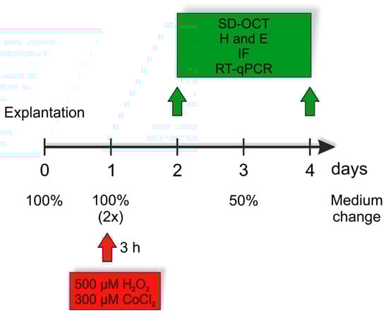 Retinal explants were cultivated for two and four days (n = 14/group/point in time). Degeneration was induced by adding 500 µM H2O2 or 300 µM CoCl2 at day one for three hours, as previously established [6]. Explants cultivated without any stressors served as controls. In all groups, medium was replaced on day zero, one, and three (Figure 1). After cultivation, retinas later used for (immuno-)histology (n = 8/group/point in time) were fixed in 4% PFA for 15 min followed by dehydration using 15% and 30% sucrose diluted in PBS for 15 or 30 min respectively. Retinas used for RT-qPCR (n = 4–5/group/point in time) were frozen at −80 °C without any further preparation. Retinas for spectral-domain optical coherence tomography (SD-OCT) were also used without modification.