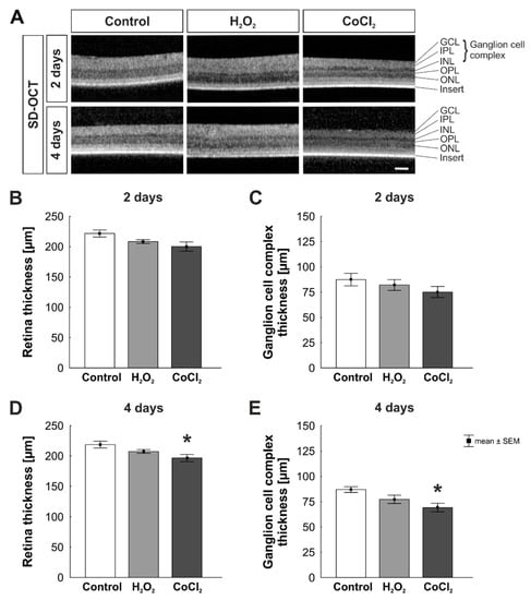 SD-OCT allows the analysis of the retinal thickness of cultured retinas during the cultivation (Figure 2A). At two days, retinal thickness was comparable in all three groups (control: 221.67 ± 5.80 µm; H2O2: 208.28 ± 3.16 µm, p = 0.273; CoCl2: 200.18 ± 7.63 µm; p = 0.055; Figure 2B). Moreover, the measurement of the ganglion cell complex, containing the GCL, IPL, and INL did not reveal any differences within the groups (control: 87.38 ± 6.21 µm; H2O2: 82.05 ± 5.34 µm, p = 0.788; CoCl2: 75.09 ± 5.48 µm; p = 0.307; Figure 2C). At four days, retinal thickness of H2O2-stressed retinas was not altered in comparison to control ones (control:218.85 ± 5.61 µm; H2O2: 207.52 ± 3.02 µm; p = 0.289). However, in CoCl2 retinas, a significant reduction of retinal thickness was noticed (196.73 ± 6.02; p = 0.024; Figure 2D). Oxidative stress had no effect on the thickness of the ganglion cell complex (control: 87.00 ± 2.81 µm; H2O2: 77.40 ± 4.07 µm, p = 0.207). Interestingly, the ganglion cell complex of CoCl2 stressed retinas was significantly thinner than of control samples (69.31 ± 4.20 µm; p = 0.015; Figure 2E).