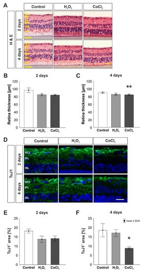 Additionally, H & E staining was performed to measure the total retinal thickness of retinal cross-sections (Figure 3A). After two days, no differences were seen in the retinal thickness neither in oxidative stressed nor in hypoxic retinas in comparison to the control group (control: 97.00 ± 5.94 µm; H2O2: 85.76 ± 3.27 µm, p = 0.154; CoCl2: 84.67 ± 2.17 µm; p = 0.109; Figure 3B). While the retinal thickness was not affected by oxidative stress at day four (control: 90.06 ± 2.25 μm; H2O2: 83.64 ± 1.68 μm, p = 0.151), hypoxia via CoCl2 led to a significantly reduced retinal thickness (78.63 ± 2.90 μm; p = 0.006; Figure 3C).