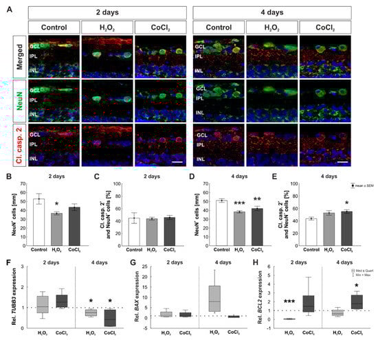 After four days of cultivation, oxidative stress (38.32 ± 1.25 NeuN+ cells/mm; p < 0.001) as well as hypoxic processes (42.12 ± 2.45 NeuN+ cells/mm; p = 0.011) led to significantly reduced NeuN+ cell counts compared to control samples (51.08 ± 2.11 NeuN+ cells/mm; Figure 4D). Interestingly, the number of apoptotic NeuN+ cells was increased in H2O2-treated retinas after four days, even though this effect was not significant (control: 43.86 ± 2.36 cl. caspase 2+ and NeuN+ cells [%]; H2O2: 52.98 ± 3.63 cl. caspase 2+ and NeuN+ cells [%], p = 0.106). However, loss of NeuN+ cells due to CoCl2 was accompanied by a significantly increased apoptosis rate (55.31 ± 2.99 cl. caspase 2+ and NeuN+ cells [%]; p = 0.035; Figure 4E).