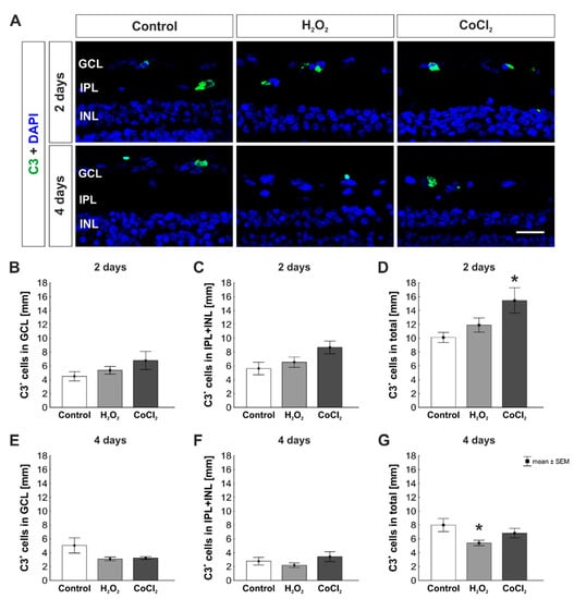At four days, no changes were observed regarding the number of C3+ cells located in the GCL (control: 5.04 ± 1.10 C3+ cells/mm; H2O2: 3.11 ± 0.27 C3+ cells/mm, p = 0.121; CoCl2: 3.23 ± 0.19 C3+ cells/mm, p = 0.153; Figure 5E). Again, at four days C3+ cell counts in the inner retinal layers were not altered within the groups (control: 2.90 ± 0.58 C3+ cells/mm; H2O2: 2.30 ± 0.34 C3+ cells/mm, p = 0.745; CoCl2: 3.59 ± 0.75 C3+ cells/mm, p = 0.686; Figure 5F). In the total retina, there were significantly fewer C3+ cells in the H2O2 group compared to controls (control: 7.99 ± 0.94 C3+ cells/mm; H2O2: 5.40 ± 0.39 C3+ cells/mm, p = 0.046; Figure 5G), whereas no difference was noted in CoCl2 retinas (6.82 ± 0.69 C3+ cells/mm, p = 0.488; Figure 5G).