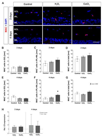 Late activation of MAC through CoCl2 in the inner retinal layers. (A) Antibody against MAC was used to visualize MAC+ cells in the retina (red). Cell nuclei were labeled with DAPI and are shown in blue. (B) Neither H2O2 nor CoCl2 had any effect on the number of MAC+ cells located in the GCL at two days. (C) At two days, the number of MAC+ cells was not altered by H2O2 or CoCl2 in inner retinal layers. (D) In the total retina, similar MAC+ cell counts were detected in all retinas. (E) At four days, the number of MAC+ cells in the GCL was alike in all three groups. (F) Interestingly, at four days, significantly more MAC+ cells were counted in CoCl2 retinas in IPL and INL (p = 0.039). (G) This effect was not seen, when counting MAC+ cells in the total retina. GCL = ganglion cell layer; IPL = inner plexiform layer; INL = inner nuclear layer. (B–G): n = 8; (H) n = 4. Scale bar: 20 µm. Values are shown as mean ± SEM for immunofluorescence and median ± quartile+min/max for RT-qPCR. The dotted line in H represents the relative expression of the control group. Columns marked with * show significant differences in comparison to the control group. * p < 0.05.