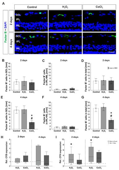 At four days, the H2O2 and the control group revealed similar factor B+ cell counts in the GCL (control: 12.87 ± 2.21 factor B+ cells/mm; H2O2: 13.23 ± 2.52 factor B+ cells/mm; p = 0.991). In contrast, CoCl2 stressed retinas displayed significantly fewer factor B+ cells (4.63 ± 1.31 factor B+ cells/mm) in comparison to controls (p = 0.028) as well as to H2O2 treated retinas (p = 0.021; Figure 7E). In contrast, the number of factor B+ cells was not altered in the inner layers of the retina at this point in time (control: 1.21 ± 0.42 factor B+ cells/mm; H2O2: 1.61 ± 0.58 factor B+ cells/mm, p = 0.839; CoCl2: 1.49 ± 0.50 factor B+ cells/mm, p = 0.917; Figure 7F). Results regarding the cell number of factor B+ cells in the total retina matched the ones described for the GCL. Again, hypoxic retinas had significantly fewer factor B+ cells than control as well as H2O2 treated ones (control: 14.08 ± 2.25 factor B+ cells/mm, p = 0.032; CoCl2: 6.13 ± 1.31 factor B+ cells/mm; H2O2: 14.84 ± 2.40 factor B+ cells/mm, p = 0.018; Figure 7G).