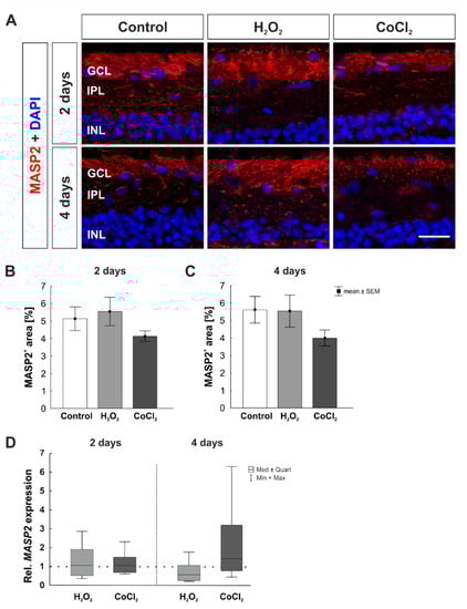 No activation of the complement system via the lectin pathway. (A) For investigation of the lectin pathway, a MASP2 antibody were used (red). Cell nuclei were stained with DAPI (blue). (B) MASP2+ staining area was not altered in any of the groups at two days. (C) Additionally, at four days, no changes were found in MASP2+ signal area. (D) In accordance, mRNA expression levels of MASP2 remained unchanged after H2O2 or CoCl2 application. GCL = ganglion cell layer; IPL = inner plexiform layer; INL = inner nuclear layer. B, C: n = 8; D: n = 4–5. Scale bar: 20 µm. Values are shown as mean ± SEM for immunofluorescence median ± quartile +min/max for RT-qPCR. The dotted line in D represents the relative expression of the control group.