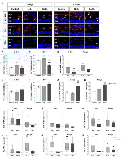 Less microglia but more C1q+ microglia in hypoxic retinas and increased inflammation in oxidative stress retinas. (A) In order to investigate microglia and their C1q immunoreactivity, a double staining with Iba1 (microglia, red) and C1q (green) was performed at two and four days. Arrows show co-localized cells. DAPI was used to mark cell nuclei (blue). (B) Oxidative stress induced a significantly increased number of microglia at two days (p = 0.016). (C) At four days, CoCl2-stressed retinas showed a significant loss of microglia (p = 0.014). (D) mRNA expression of ITGAM, a gene which encodes for Cd11b, was significantly downregulated in CoCl2 retinas at two days (p = 0.003). (E) At two days, the total number of C1q+ cells in the retina was not altered in any group. (F) Also, at four days, the C1q+ cell counts were comparable in all groups. (G) At two days, CoCl2-stressed retinas had significantly more C1q+ microglia than H2O2-retinas (p = 0.009) as well as control retinas (p = 0.005). (H) After four days of cultivation, CoCl2-stressed retinas displayed significantly more C1q+ microglia than control retinas (p = 0.003). (I) C1QA mRNA levels were significantly upregulated in H2O2-stressed retinas at two days (p = 0.03). (J) RT-qPCR analyses revealed an unaltered mRNA expression level of C1QB in H2O2- and CoCl2-stressed retinas in both investigated points in time. (K) Regarding C1QC mRNA levels, a significant downregulation was noted in hypoxic retinas at two days (p = 0.046). (L) TNF mRNA levels were significantly upregulated after four days, when retinas were exposed to oxidative stress (p = 0.002). (M) Retinas, which were cultivated with H2O2, had a significantly upregulated IL6 mRNA expression at two and four days (both: p = 0.02). (N) Oxidative stress had no effect on the mRNA expression of IL8 at two days and a significant upregulation at four days (p = 0.04). Hypoxic processes also increased the mRNA expression of IL8 significantly at four days (p = 0.03). GCL = ganglion cell layer; IPL = inner plexiform layer; INL = inner nuclear layer. (B,C,E–H): n = 8; (D,I–N): n = 4–5. Scale bar: 20 µm. Values are shown as mean ± SEM for immunofluorescence and median ± quartile +min/max for RT-qPCR. The dotted lines in (D,I–N) represent the relative expression of the control group. Columns marked with * show significant differences in comparison to the control group. Columns marked with # show significances between H2O2 and CoCl2. * p < 0.05; **, ## p < 0.01; ### p < 0.001.