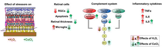 Graphical summary of the study. Porcine retinas were cultivated for two and four days. The role of the complement system was evaluated after the induction of oxidative stress or hypoxia. Both stressors, H2O2 (shown with red arrows) and CoCl2 (shown with green arrows) had strong degenerating effects on retinal ganglion cells (RGCs). Hypoxic retinas, stressed with CoCl2, had more apoptotic RGCs and had a significantly decreased thickness of the whole retina as well as of the ganglion cell complex. Different effects of H2O2 and CoCl2 on microglia were noted: H2O2-stressed retinas led to more microglia whereas CoCl2 was toxic to microglia. The complement system played no prominent role in oxidative stressed retinas, but there was a strong activation of the complement system occurring via the classical pathway in hypoxic retinas. Furthermore, we noted a strong increase of inflammatory cytokines mostly in H2O2-stressed retinas.