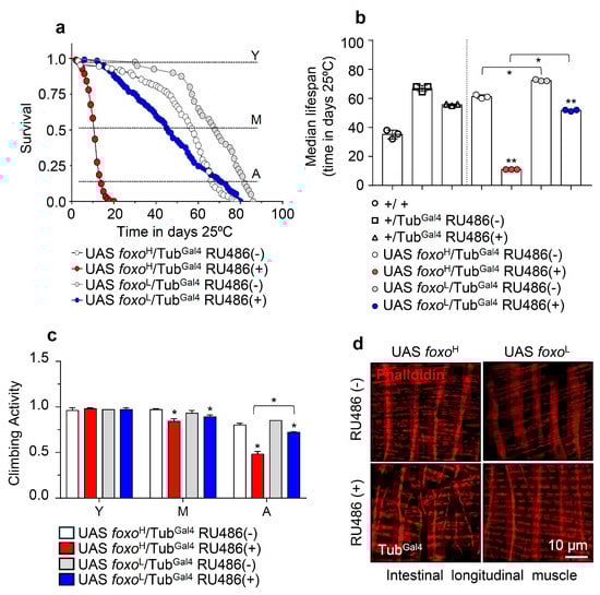 Ubiquitous foxo OE accelerates aging phenotypes in a dose-dependent manner. (a) Survival curves of foxoH and foxoL overexpressing flies and (b) median lifespan of foxo overexpressing flies vs. respective controls [i.e., +/+ (w1118 flies), +/TubGal4 RU486(−) and +/TubGal4 RU486(+) flies]. Statistics of longevity assays are shown in Table S1. (c) Locomotion (climbing activity) of young (Y), middle-aged (M), and aged (A) foxo overexpressing flies vs. controls. (d) Representative CLSM images of intestinal longitudinal muscle fibers’ actin filaments (Phalloidin stain) of female middle-aged foxo overexpressing flies vs. control. Bars, ±SD; n ≥ 3, ≥10 flies were analyzed per experimental repeat. Statistical significance was measured with unpaired t-test, * p < 0.05, ** p < 0.01.