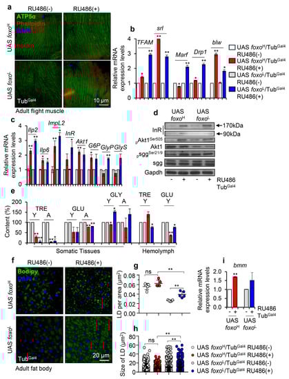 Next, we investigated the content of sugars in isolated somatic tissues and hemolymph of both young and aged control and transgenic flies. We found that trehalose (TRE), a principal circulating sugar in hemolymph that serves as an efficient flight fuel due to its higher vs. glucose (GLU) [32] energy yield, was decreased in the somatic tissues of both transgenic lines and in the hemolymph of foxoL flies (Figure 2e). Also, foxo OE suppressed (in both lines) GLU levels in somatic tissues and hemolymph, while glycogen (GLY) levels were found to decrease (likely due to increased breakdown) in foxoH and increase in foxoL transgenic flies (Figure 2e). Moreover, staining of an alternative source for energy storage, i.e., lipid droplets (LDs) in flies’ fat body tissues (Figure 2f), showed that the LDs in foxo overexpressing flies tended to increase in number but to be smaller in size as compared to control; these readouts were more intense in foxoL flies since even non-induced foxoH flies already showed intense lipolysis probably due to leaky transgene expression, once again underlying the importance of gene-dosage in foxo-induced phenotypes (Figure 2g,h). Consistently, foxo OE in both lines triggered a dose-dependent upregulation of bmm (also known as ATGL) (Figure 2i), which enhances fat storage depletion under nutritional deprivation [33].