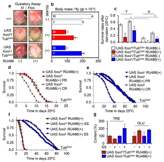 Taking into consideration the hypoglycemic and lipolytic state of foxo overexpressing flies’ tissues and the fact that foxo is an important regulator of IIS in the peripheral tissues and in regulating food intake [34], we then analyzed the food consumption and body weight of foxo overexpressing flies. We found that foxo OE reduces feeding rates (Figure 3a) and body weight (body mass/fly) (Figure 3b) in a dose-dependent manner. Further, we tested the tolerance of foxo overexpressing flies to metabolic stress by firstly exposing them to starvation. We found that foxo OE increased (dose-dependently) flies’ sensitivity to nutrients deprivation (Figure 3c). Moreover, we observed that while calories restriction (CR) was toxic for both foxo transgenic lines, protein restriction (PR) did not affect significantly their median lifespan (Figure 3d,e). Given that foxo overexpressing flies had reduced somatic and circulating sugar levels (see above), we then supplemented flies’ culture medium with additional sugar. Interestingly, sugar over-supplementation (SS) significantly increased (vs. control) by ~20% the median lifespan of foxoL, but not of foxoH, line (Figure 3f). Since the increase in foxoL flies’ median lifespan following additional sugar supplementation was paralleled by increased TRE and GLU tissue levels (Figure 3g), it is likely that the hypoglycemia induced after ubiquitous foxo OE is a key factor to reduced longevity.