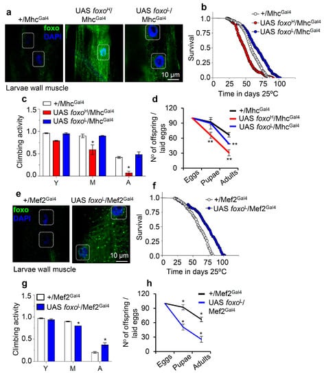 To study whether tissue-specific foxo OE can differentially affect flies’ physiology and longevity, we overexpressed foxo in muscles by using the MhcGal4 and Mef2Gal4 drivers (which induce moderate and strong transgene expression, respectively), as well as in cardiomyocytes by employing the tinC.Δ4Gal4 driver (induces strong transgene expression).