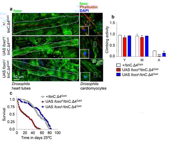 - Blice-Baum, A.C.; Kaushik, G.; Viswanathan, M.C.; Zambon, A.C.; Engler, A.J.; Bodmer, R.; Cammarato, A. Overexpression of Foxo in the Heart Ameliorates Performance Decline through Enhanced UPS Processing in Aging Drosophila. Biophys. J. 2015, 108, 361a. [Google Scholar] [CrossRef][Green Version]