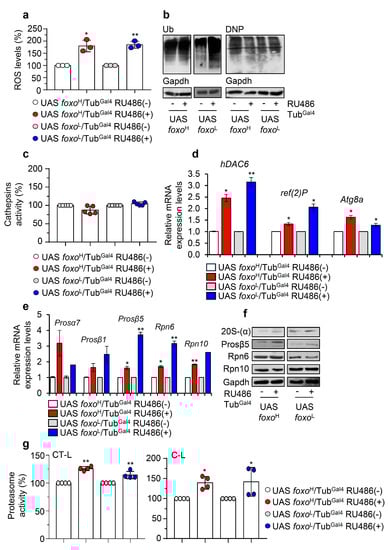 Considering the suggested regulatory role of foxo on proteostasis [11], we then investigated the impact of foxo OE on proteostatic pathways. Ubiquitous foxo OE resulted in increased ROS levels (Figure 6a) and accumulating ubiquitinated and carbonylated polypeptides (Figure 6b), suggesting extensive oxidative and proteostatic instability. In support, although we found no significant alternations in cellular cathepsins activity status in either foxo overexpressing lines (Figure 6c), we noted in both lines upregulation of antioxidant (not shown) and autophagy-related (hDAC6, ref(2)P, Atg8a) genes (Figure 6d); also, we found a significant induction of proteasomal genes (Prosα7, Prosβ1, Prosβ5, Rpn6, Rpn10) (Figure 6e) and of most protein subunits [20S-(a), Prosβ5 and Rpn6] (Figure 6f and Figure S6a), as well as of both of chymotrypsin- (CT-L) and caspase- (C-L) like 26S proteasome activities after ubiquitous foxo OE (Figure 6g).