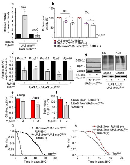 3.5. Proteasome Activation in foxo OE Transgenic Flies Is Nrf2/cncC-Mediated