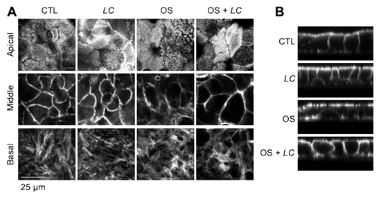 Figure 2. L. casei prevents osmotic stress-induced remodeling of the actin cytoskeleton and dissociation of junctional proteins. (A) Caco-2 cell monolayers (13 days post-seeding) preincubated with or without L. casei (LC; 105 cells/mL) for 30 min, followed by osmotic stress (OS) by incubation in the hyperosmotic medium; control (CTL) monolayers received similar treatments in the iso-osmotic medium. After one hour of OS, cell monolayers were fixed and stained for F-actin using AlexaFluor-488-labeled phalloidin. Confocal fluorescence images from 2 µm optical sections at the apical, middle, and basal regions of cells are presented. (B) Z-section images showing the differential distribution of actin cytoskeleton at different levels of the epithelium.