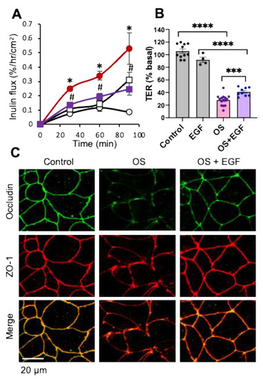 Figure 3. EGF prevents osmotic stress-induced tight junction disruption and barrier dysfunction in Caco-2 cell monolayers. (A,B) Caco-2 cell monolayers (13–15 days post-seeding) were pretreated with (□, ) or without (○, ) EGF (30 nM) for 30 min followed by osmotic stress (OS) by incubation in hyperosmotic medium (, ). Inulin flux (A) and TER (B) were measured at varying times. The control group received similar treatments in the iso-osmotic medium. Values are mean ± SEM (n = 3–17 from six experiments for the time course of inulin flux; n = 3–15 from five experiments for TER measured after 90 min OS). In panel A, * indicates the OS values () that are significantly (p < 0.05) different from the corresponding CTL values (○); # indicates that OS + LC values () are significantly (p < 0.05) different from corresponding OS values (). In panel B, asterisks represent significant difference between indicated groups; *** = p < 0.005; **** = p < 0.001. (C) After 90 min OS treatment, cell monolayers were fixed and co-stained for occludin (green) and ZO-1 (red). Fluorescence images were captured by confocal microscopy. The orange color in merged images indicate co-localization of occludin and ZO-1.