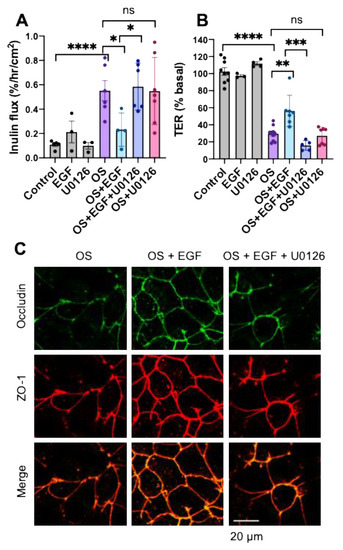 Figure 4. EGF prevents osmotic stress-induced tight junction disruption and barrier dysfunction by a MAP kinase-dependent mechanism. (A,B) Caco-2 cell monolayers (14 days post-seeding) were pretreated with or without U0126 (10 μM) for 30 min before incubation with EGF (30 nM). After 30 min EGF treatment, cell monolayers were exposed to osmotic stress (OS) by incubation in the hyperosmotic medium; the control group received similar treatment without EGF, U0126, or OS. Other controls included EGF-alone or U0126-alone treatments. Inulin flux (A) and TER (B) were measured at one hour of OS treatment. Values are mean ± SEM (n = 3-6 from two experiments for inulin flux; n = 3–9 from three experiments for TER); * = p<0.05; ** = p < 0.01; *** = p < 0.005; **** = p < 0.001; “ns” = not significant. (C) After 90 min OS treatment, cell monolayers were fixed and co-stained for occludin (green) and ZO-1 (red). Fluorescence images were captured by confocal microscopy. The orange color in merged images indicate co-localization of occludin and ZO-1.