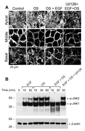 Figure 5. EGF prevents osmotic stress-induced actin cytoskeleton remodeling by a MAP kinase-dependent mechanism. Caco-2 cell monolayers (13 days post-seeding) were pretreated with or without U0126 (10 μM) for 30 min before incubation with EGF (30 nM). After 30 min EGF treatment, cell monolayers were exposed to osmotic stress (OS) by incubation in the hyperosmotic medium; the control group received similar treatment without EGF, U0126, or OS. (A) After one hour of OS treatment, cell monolayers were fixed and stained for F-actin using AlexaFluor-488-labeled phalloidin. Confocal fluorescence images from 2 µm optical sections at the apical, middle, and basal regions of the cells are presented. (B) Caco-2 cell monolayers (17 days post-seeding) were treated similar to panel (A). At varying times after OS with or without EGF and U0126, Caco-2 cell extracts were immunoblotted for JNK(pT183/pY185) and β-actin. Numbers on the left border of the images represent the molecular weight of markers.