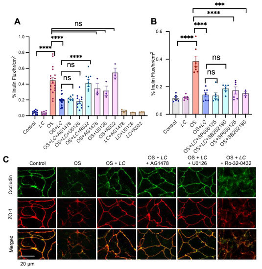 Figure 6. Inhibition of PKC activity blocks L. casei-mediated prevention of osmotic stress effects on the tight junction and barrier function. (A) Caco-2 cell monolayers (13–15 days post-seeding) were incubated with or without Ro-32-0432 (R032; the PKC inhibitor; 1 μM), AG1478 (3 μM; the EGFR tyrosine inhibitor), or U0126 (10 μM) for 30 min before L. casei (LC; 105 cells/mL) administration. Osmotic stress (OS) was induced at 30 min LC treatment by incubation with a hyperosmotic medium. Inulin flux was measured at 90 min OS treatment. The values are mean ± SEM (n = 3–18 from six experiments); **** = p < 0.001, “ns” = not significant. (B) As described above, cell monolayers were treated with SP600125 (1 μM; the JNK inhibitor) or SB202190 (5 μM; the p38 MAP kinase inhibitor) before incubating with LC and OS. The inulin flux values are mean ± SEM (n = 3–7 from two experiments); *** = p < 0.005; **** = p < 0.001, “ns” = not significant. (C) After one hour of osmotic stress, cell monolayers were fixed and stained for occludin (green) and ZO-1 (red). Fluorescence images were captured by confocal microscopy. The orange or yellow color in merged images indicate co-localization of occludin and ZO-1.