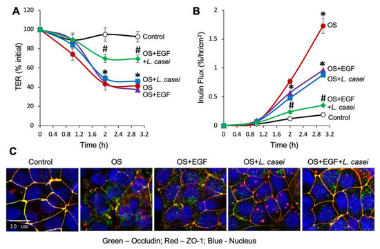 Figure 7. EGF and L. casei synergistically prevents osmotic stress-induced tight junction disruption and barrier dysfunction in Caco-2 cell monolayers. (A,B) Caco-2 cell monolayers (11-13 days post-seeding) were pretreated with 10 nM EGF (), L. casei (LC; 104 cells/mL) (), EGF + L. casei (), or carrier (●) for 30 min followed by osmotic stress (OS) by incubation in hyperosmotic medium. The control monolayers (○) received no treatments. TER (A) and inulin flux (B) were measured at varying times. Values are mean ± SEM (n = 6); * indicates the values for OS with or without EGF or LC alone (, , ) are significantly (p < 0.05) different from the corresponding CTL values (○); # indicates that OS+EGF+LC values () are significantly (p < 0.05) different from corresponding OS with or without EGF or LC values (, , ). (C) At 3 h of OS treatment, cell monolayers were fixed and co-stained for occludin and ZO-1 and fluorescence images were captured by confocal microscopy. The orange or yellow color in merged images indicate co-localization of occludin and ZO-1.