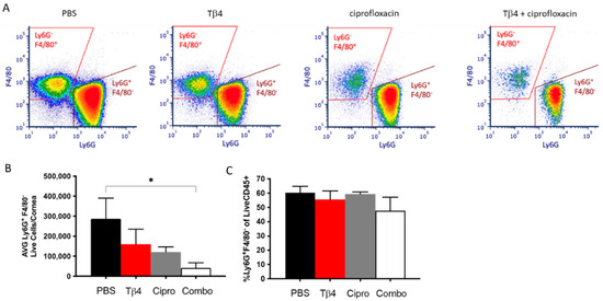 Flow cytometry results of PMN cellular infiltrates following P. aeruginosa-induced corneal infection. CD45+ Ly6G+ F4/80− leukocytes identified as PMNs as determined by flow cytometry at 3 days p.i. in corneas of PBS-, Tβ4-, cipro-, and adjunct Tβ4-treated B6 mice (A). Results are shown as averages of single cell populations (B) and % of live PMNs per total population of live leukocytes (C). n = 5 corneas/group; * p < 0.05.