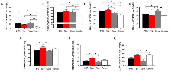 Expression of cell surface markers as detected on PMNs by flow cytometry. Select proinflammatory molecules CD13 (A), CD177 (B), CD80 (C), and CD63 (D) and anti-inflammatory molecules AnxA1 (E), CD192 (F), and CD206 (G) were detected on CD45+ Ly6G+ F4/80− PMNs from 3 day-infected corneas of PBS-, Tβ4-, cipro-, and adjunct-treated B6 mice. Results are shown as averages of singlet populations for CD45+ Ly6G+ F4/80− PMNs. n = 5 corneas/group; * p < 0.05, ** p < 0.01.