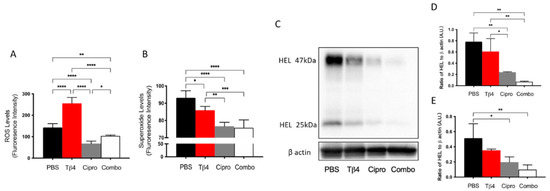 One of the principal mechanisms of PMNs to fight against pathogens is to release ROS [43]. Conversely, large amounts of ROS generated in dysregulated inflammation is the primary pathogenic mechanism inducing inflammatory damage [44]. Therefore, potential differences in ROS levels (A) between treatment groups were examined at three days p.i. as shown in Figure 3. Tβ4 only resulted in a tremendous increase in the production of ROS when compared to all other groups. Both the ciprofloxacin and adjunctive Tβ4 treatment groups significantly hindered ROS generation compared to the PBS control. 2′,7′-dichlorofluorescin diacetate (DCFH-DA) is oxidized by ROS, resulting in the stable fluorescent end product, dichlorofluorescein (DCF) [45]. The findings revealed that all treatment groups significantly inhibited superoxide production compared to the PBS control, as indicated by DCF measurement (B). Dihydroethidium (DHE), a freely permeable ROS-specific fluorescent dye, is oxidized to ethidium by superoxide radicals (O2−) [45]. Following incubation with DHE, superoxide was measured in infected corneas, as well. Remarkably, both ciprofloxacin and the adjunctive Tβ4 treatment groups further decreased superoxide levels when compared to Tβ4 alone. These findings were then confirmed by detecting HEL adduct formation (C–E), which takes place during the early stages of ROS-induced lipid peroxidation [46]. PBS controls revealed strong lipid peroxidation with detectable HEL adduct formation at approximately 25 kDa (D) and 47 kDa (E); no differences were detected after Tβ4 alone treatment. Whereas both ciprofloxacin and adjunctive Tβ4 treatments resulted in significantly blunted HEL adduct formation, as quantified by a densitometric analysis of the two predominate bands. These results further illustrate that adjunctive Tβ4 treatment not only influences the phenotypical profiles of PMNs but also inhibits a key cellular function in the corneas of P. aeruginosa-infected mice.