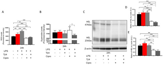 Many different types of inflammatory cells function together in response to corneal infections. Carrying out in vitro examination of PMNs allows for the exclusion of confounding factors, particularly other inflammatory cells and the presence of bacteria. Therefore, complimentary in vitro studies were conducted to further confirm the in vivo findings regarding how Tβ4 affects PMN cellular function (Figure 4A–E) using LPS, a major component of the Pseudomonas cell wall known to be a robust virulence factor and activator of TLR4, which plays a key role in neutrophil activation [47]. LPS-induced ROS and HEL adduct levels were evaluated at 24 h after stimulation by using peritoneal-derived PMNs from B6 mice. The results reveal that the production of ROS (A) significantly increased after LPS stimulation and that Tβ4 only treatment, similar to in vivo findings, enhanced ROS generation when compared to all groups at 24 h. However, the ciprofloxacin and adjunctive Tβ4 treatment groups significantly inhibited LPS-induced ROS levels. Superoxide levels (B) were similarly expressed among all experimental groups except for a significant decrease observed between the adjunctive Tβ4 and ciprofloxacin only groups. The inhibitory effect of adjunctive Tβ4 was further revealed through significantly decreased HEL adduct formation (C–E). The HEL adducts, formed at approximately 47 kDa and 25 kDa, were uniformly expressed among media only, LPS only, and Tβ4 only groups. Notably, both the ciprofloxacin and adjunctive Tβ4 treatments significantly inhibited LPS-induced HEL adduct formation at 24 h. These data demonstrate that both ciprofloxacin and adjunctive Tβ4 treatments effectively inhibit the generation of ROS after LPS stimulation, which protects activated PMNs from subsequent ROS-induced membrane damage; however, it is likely that this particular effect may be due to ciprofloxacin alone as demonstrated by both the in vivo and in vitro assessments.