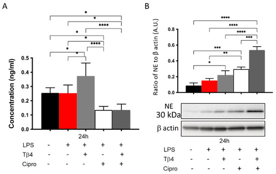 In vitro assessment of NETosis activity in peritoneal-isolated PMN following LPS stimulation. Data are shown as mean concentration (ng/mL) of H3 ± SD (A) or NE normalized to β-actin ± SD (B). Data are representative of three independent experiments. n = 3; * p < 0.05; ** p < 0.01; *** p < 0.001; and **** p < 0.0001.