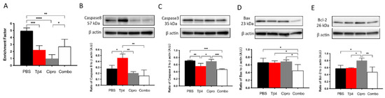 It has been shown that exogenous Tβ4 plays an anti-apoptotic role in ethanol-stimulated corneal epithelial cells by inhibiting the release of cytochrome c from the mitochondria and suppressing the activation of caspases [48]. To study the effect of Tβ4 on apoptosis in the current infectious model, we assessed total cytoplasmic cell death and multiple critical enzymes involved in the apoptotic pathway (Figure 7A–E). Histone-associated DNA fragments generated subsequent to cell death were detected at 3 days p.i. (A). The results suggest that both the Tβ4 alone and adjunctive Tβ4 treatment groups significantly inhibited cell death when compared to the PBS control. Surprisingly, ciprofloxacin treatment exhibited the most apparent reduction in cell death when compared to all other groups. Levels of caspase-8, an extrinsic apoptotic pathway enzyme, were measured to explore the activation of initiator caspases during apoptosis (B). We found that Tβ4 only treatment significantly boosted the production of caspase-8 when compared to other treatment groups. However, both ciprofloxacin and adjunctive Tβ4 treatments significantly downregulated the expression of caspase-8. To elucidate the converging roles of downstream effector caspases in inciting apoptotic cell death, caspase-3 activity (C) was assessed, as well. Levels of caspase-3 were significantly inhibited in both Tβ4 only and adjunctive Tβ4 treatment groups when compared to both the PBS controls and ciprofloxacin treatment. In addition, Bax (D), a proapoptotic molecule involved in the intrinsic pathway, was uniformly expressed among the PBS control, Tβ4 only, and ciprofloxacin treatment groups. However, it was significantly decreased with adjunctive Tβ4 treatment when compared to all other groups. Bcl-2 (E), an antiapoptotic molecule in the intrinsic apoptosis pathway, was similarly expressed in the PBS control, Tβ4 only, and adjunctive Tβ4 treatment groups but significantly upregulated with the ciprofloxacin only treatment. These findings indicate that adjunctive Tβ4 treatment represses apoptosis by regulating aspects of both the extrinsic and intrinsic apoptotic pathways.