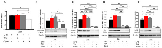 In vitro assessment of apoptotic activity following LPS-induced stimulation of peritoneal-derived PMNs. Cytoplasmic DNA fragments (A), caspase-8 (B), caspase-3 (C), Bax (D), and Bcl-2 (E) were assessed after Tβ4, cipro, and adjunct Tβ4 treatments. Levels as detected by Western blot are presented as a ratio to β-actin ± SD. n = 3; * p < 0.05, ** p < 0.01; *** p < 0.001, and **** p < 0.0001.