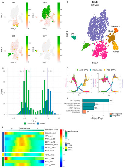 - Xin, Y.; Gutierrez, G.D.; Okamoto, H.; Kim, J.; Lee, A.-H.; Adler, C.; Ni, M.; Yancopoulos, G.D.; Murphy, A.J.; Gromada, J. Pseudotime Ordering of Single Human β-Cells Reveals States of Insulin Production and Unfolded Protein Response. Diabetes 2018, 67, 1783–1794. [Google Scholar] [CrossRef] [PubMed] [Green Version]
