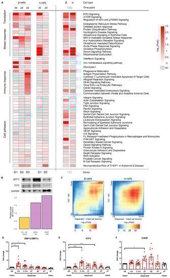 Furthermore, we specifically checked whether the pathways affected upon dispersion were also altered in cells from type 2 diabetic donors (Figure 2A). Genes involved in translation (EIF2 signalling, mTOR and ‘regulation of eIF4 and P70S6K’ signalling) and stress response (UPR, protein ubiquitination-related pathways) are differentially regulated in β-cells from individuals with type 2 diabetes. Noteworthy, the ER stress and the NRF2-mediated oxidative stress pathways are not detected in the differentially expressed genes in α-cells. Pathways involved in phagosome maturation and iron homeostasis are affected in both cell types. Interestingly, the cell-adhesion-related pathways are also differentially regulated in β-cells from subjects with type 2 diabetes.