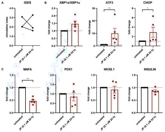 Altering the actin cytoskeleton triggers ER stress and affects β-cell identity and function. (A) Islet integrity disruption is further studied by altering the actin cytoskeleton using jasplakinolide (JP). Affecting the actin cytoskeleton in human islets with 0.1 μM JP for 24 h leads to decreased glucose-stimulated insulin secretion in two of three donors. GSIS was performed immediately after 24 h JP treatment. (B) Treatment of isolated human islets with 0.1 μM JP for 24 h leads to increased mRNA expression levels of the ER stress marker genes ATF3 and CHOP. (C) Treatment of isolated human islets with 0.1 μM JP for 24 h leads to decreased mRNA expression levels of the β-cell-specific gene MAFA but not PDX1, NKX6.1 and insulin as measured by qPCR. Data are presented as means ± SEM of fold change over untreated control islets. n = 5 donors; each data point represents one donor. * p < 0.05, ** p < 0.01 vs. untreated control islets.