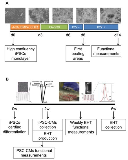 Schematic of the protocol for the differentiation of cardiomyocytes from human iPSCs and complete EHT experimentation. (A) Cardiac differentiation consisted of a first step with 20 ng/mL of BMP4, 20 ng/mL of activinA, and 1.5 µM of CHIR99021 for mesoderm induction, followed by a second step with 5 µM of XAV939 for WNT signal inhibition and cardiac specification, and finally, insulin was added from day 8, after the first beating areas were observed. (B) The experimental design started with iPSCs cardio-differentiation and baseline functional measurements before the iPSC-CMs were collected and used for EHT production; later, EHT contractility was measured twice a week for 28 days until the end of the experiment.