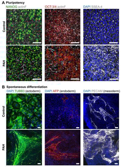 Pluripotency and spontaneous differentiation capacity of the control and PAH iPSCs. (A) Representative images confirming protein expression of pluripotency (NANOG, OCT-3/4, and SSEA-4) markers on the control and PAH iPSCs. (B) Representative images confirming protein expression of spontaneous differentiation markers (TUBB3, AFP, and PECAM) on the control and PAH iPSCs. Scale bars = 50 µm.