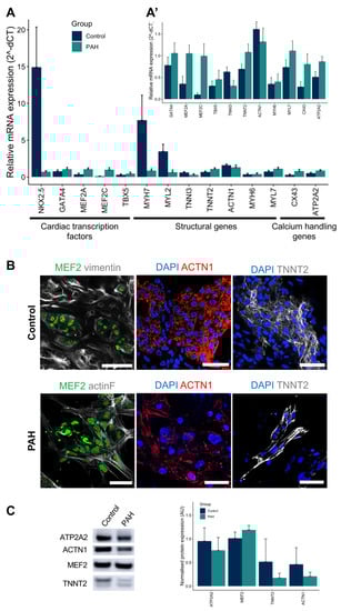 Control and PAH iPSC-CM characterization at both the gene and protein levels. (A) Gene expression of cardiac transcription factors (NKX2.5, TBX5, MEF2A, MEF2C, and GATA4), structural genes (ACTN1, MYH6, MYH7, MYL2, MYL7, TNNI3, and TNNT2), and calcium-handling genes (ATP2A2 and CX43) genes for the control and PAH iPSC-CMs (mean + SD, N = 6 for the control, and N = 6 for the PAH cardio-differentiation batches). (A’) Gene expression of previous genes except NKX2.5, MYH7, and MYH6 to appreciate smaller expressions in detail. (B) Representative images confirming nuclear expression of MEF2 (green), sarcomeric ACTN1 (red), and TNNT2 (grey) on the control and PAH iPSC-CMs. Scale bars = 50 µm. (C) Representative Western blot bands and protein quantification of ATP2A2, MEF2, TNNT2, and ACTN1 cardiac markers on the control and PAH iPSC-CMs (mean + SD, N = 5 control, and N = 4 PAH).