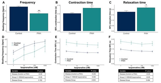 Furthermore, iPSC-CMs responded to β-adrenergic stimulation by increasing the beating frequency and by slightly decreasing contraction and relaxation times. Both the control and PAH iPSC-CMs have an analogous response to increasing concentrations of isoprenaline but different starting points because of the baseline contractile differences previously mentioned (Figure 4D–F).