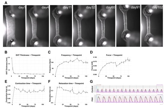 Long-term EHT experimentation and functional follow-up under spontaneous beating conditions. (A) Representative bright field images of 3D EHTs at different timepoints over 3 months. (B) Quantification of EHT thickness (mm) in the rectangular part of the 3D EHTs over time. (C–F) Beating frequency (bpm), force (mN), contraction time (s), and relaxation time (s) in 3D EHTs (mean ± SD, N = 8 PAH EHTs). (G) Representative twitch tracings for the control and PAH EHTs for 10 s (force (mN) in red and velocity (mN/s) in pink).