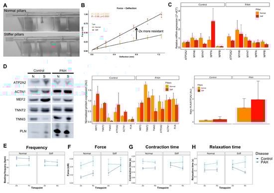 Increased afterload on control and PAH EHTs. (A) Image of normal and stiffer silicone posts. (B) Elastic characterization of normal and stiffer silicone posts plotting the force measured at different post deflections to calculate their resistance and spring constant (mN/mm). (C) Gene expression of structural and hypertrophic markers (ATP2A2, MYH6, MYH7, NPPA, and NPPB) on the control and PAH EHTs cultured with normal or stiffer silicone posts for 28 days (mean + SD, N ≥ 9 normal and ≥11 stiff control EHTs, and N ≥ 17 normal and ≥11 stiff PAH EHTs). (D) Representative Western blot bands and protein quantification of ACTN1, MEF2, TNNT2, TNNI3, PLN, and ATP2A2 cardiac markers on the control and PAH EHTs cultured with normal or stiffer silicone posts for 28 days (mean + SD, N = 3 normal and 2 stiff control EHTs, and N = 6 normal and 3 stiff PAH EHTs). (E–H) Beating frequency (bpm), force (mN), contraction time (s), and relaxation time (s) in the control and PAH EHTs cultured with normal or stiffer silicone posts under spontaneous beating conditions at 2 and 4 weeks (mean ± SD; N = 23 normal and 17 stiff control EHTs, and N = 17 normal and 8 stiff PAH EHTs).