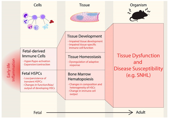 Early life inflammation as a driver of disease susceptibility. Perinatal inflammation can drive lasting changes to immune function from fetal development onwards by perturbing immune function at the cellular, tissue, and whole organism level. Impaired development of fetal-derived immune cells that influence tissue development and homeostasis can ultimately impair tissue function. Specifically, fetal-derived immune cell compartments can either be expanded or reduced by inflammation, or cells can by hyper- or hypo-activated. Perturbing the establishment and function of developing fetal hematopoietic stem and progenitor cells (HSPCs) by inducing loss or persistence of transient HSPCs, or shaping function and output of developing HSCs may also result in lasting changes to the composition or output of the adult hematopoietic stem cell (HSC) compartment. Ultimately, the effects of perinatal inflammation on both developing HSPCs and fetal-derived immune cells may reshape the trajectory of postnatal immunity and susceptibility to disease by impinging on tissue immunity and/or the output of the hematopoietic system.
