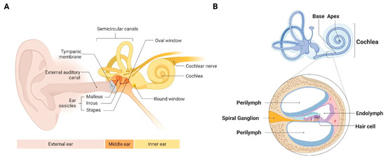 As sound waves enter the ear canal, they are amplified via vibration of the ear drum and a small chain of bones in the middle ear, called the ossicles, which then transmit through the oval window to the cochlea (Figure 2A). As the oval window oscillates, it sends waves through the fluid within the cochlea called the perilymph. These fluid waves displace the stereocilia located on the apical end of the inner hair cells (IHC) which are specialized cells surrounded by potassium-rich endolymph. A blood labyrinthine barrier (BLB) is created between the perilymph and endolymph fluids which is essential for normal inner ear function. The endolymph, the fluid within the inner ear membranous labyrinth and the perilymph, the fluid that surrounds this membranous labyrinth differ markedly in their potassium composition [95]. This potassium ion gradient creates an endocochlear potential which is maintained by a network of blood vessels in the lateral wall of the cochlea called the stria vascularis (Figure 2B). The topographic arrangement of the cells enables specific hair cells to depolarize in a frequency-specific fashion, resulting in opening of channels to mediate entry of potassium ions that generate an action potential. These coordinated steps successfully convert mechanical sound waves into nerve impulses that are transmitted to the spiral ganglion of the cochlear nerve, and then travel along the cochlear nerve to the brain for interpretation. A second type of mechanosensory cell is the outer hair cell (OHC). This cell also transduces the mechanical force generated by sound waves into an electrical signal. OHCs are responsible for an active mechanical amplification process that leads to fine tuning and increased sensitivity to sound inputs. Dysfunction of any of these structures can lead to hearing loss, although OHCs tend to be the most vulnerable to injury.