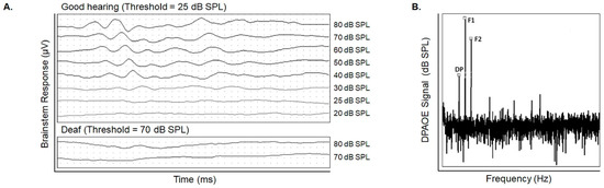 A key characteristic of the cochlea is its topographical organization. Hair cells located near the base of the cochlea respond to high-frequency sound waves, and hair cells near the cochlear apex respond to low-frequency sound waves (Figure 2B). We can perform frequency-specific measurements of auditory function through established hearing assessment methods using distortion product otoacoustic emission (DPOAE), auditory brainstem response (ABR) and behavioral testing (in humans). In ABR testing, probes are placed on the individual’s or animal’s head to measure evoked potentials milliseconds following a sound stimulus. The probes detect responses from the auditory pathway from the cochlea to the brainstem (Figure 3A). DPOAE detect emissions generated from OHCs. In DPOAE testing, two sound frequencies are presented into the ear canal. If functioning OHCs are present, they will resonate with the sound waves and emit a distortion product of the two sound waves (Figure 3B) [96]. Put simply, DPOAE is a more specific measure of functioning OHCs, and ABR is an overall measure of the auditory pathway [95]. Visual reinforced audiometry (VRA) and conditioned play audiometry (CPA) are two other behavioral diagnostic methods of choice in children [97,98]. A key outcome of DPOAE, behavioral and ABR testing is the hearing threshold, or the lowest intensity that elicits a response at a given frequency. Therefore, higher thresholds indicate worse hearing, and lower thresholds indicate better hearing. All methods are performed at high, middle, and low frequencies to measure the cochlea’s sensitivity along the basal, mid, and apical turns, respectively. Combined results of DPOAE, behavioral and ABR testing may indicate whether OHC damage or other cochlear structures mediate SNHL [94]. One exception to the hearing measures being an accurate reflection to function is synaptopathy; clinical audiometric approaches cannot reveal the presence of neurodegeneration in humans [99]). However, cochlear functional assays and confocal microscopy have been used to demonstrate transient thresholds elevation and delayed cochlear nerve degeneration in mice [100].