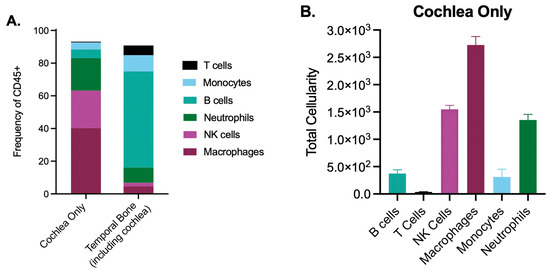 Striking differences were observed when the temporal bone was included in analysis of cochlear immune populations. Overall, our analysis at PD10 revealed the identity of 93.1% of live CD45+ cochlear immune cells, and 90.8% of live CD45+ temporal bone immune cells. In the cochlea only, live CD45+ cells were composed primarily of macrophages (40.3%, F4/80hiCD11b+), followed by NK cells (22.9%, NK1.1+), and neutrophils (19.9%, Ly6G+). Only a small fraction of cochlear cells included B cells (5.3% CD19+), monocytes (4.2%, F4/80midCD11b+), and T cells (0.5%, CD3+). In contrast, the temporal bone was composed primarily of B cells (58.8%), with smaller fractions of monocytes (10.0%), neutrophils (9.4%), T cells (5.9%), macrophages (4.6%), and NK cells (2.2%). The same surface markers were used to identify immune populations within the temporal bone and cochlea. Overall, immune cell frequencies in the PD10 cochlea were similar to those reported in the adult cochlea [110]. Notably, our findings suggest a greater number of identified immune cells (Figure 4B) than previously published data, as well as characterize a higher frequency of CD45+ cochlear immune cells. However, surface markers used to identify immune populations often differ across different studies, particularly for myeloid populations which can be alternately defined using markers such ascF4/80, Gr-1/Ly6G, Ly6C, CD11c, CX3CR1, and Iba1. Varying combinations of these markers to identify myeloid populations may account for reported differences in frequencies. More refined protocols will be important for ascertaining cochlear-specific immune populations and defining homeostatic immune populations at baseline in comparison to infiltrating immune populations present during inflammatory conditions.